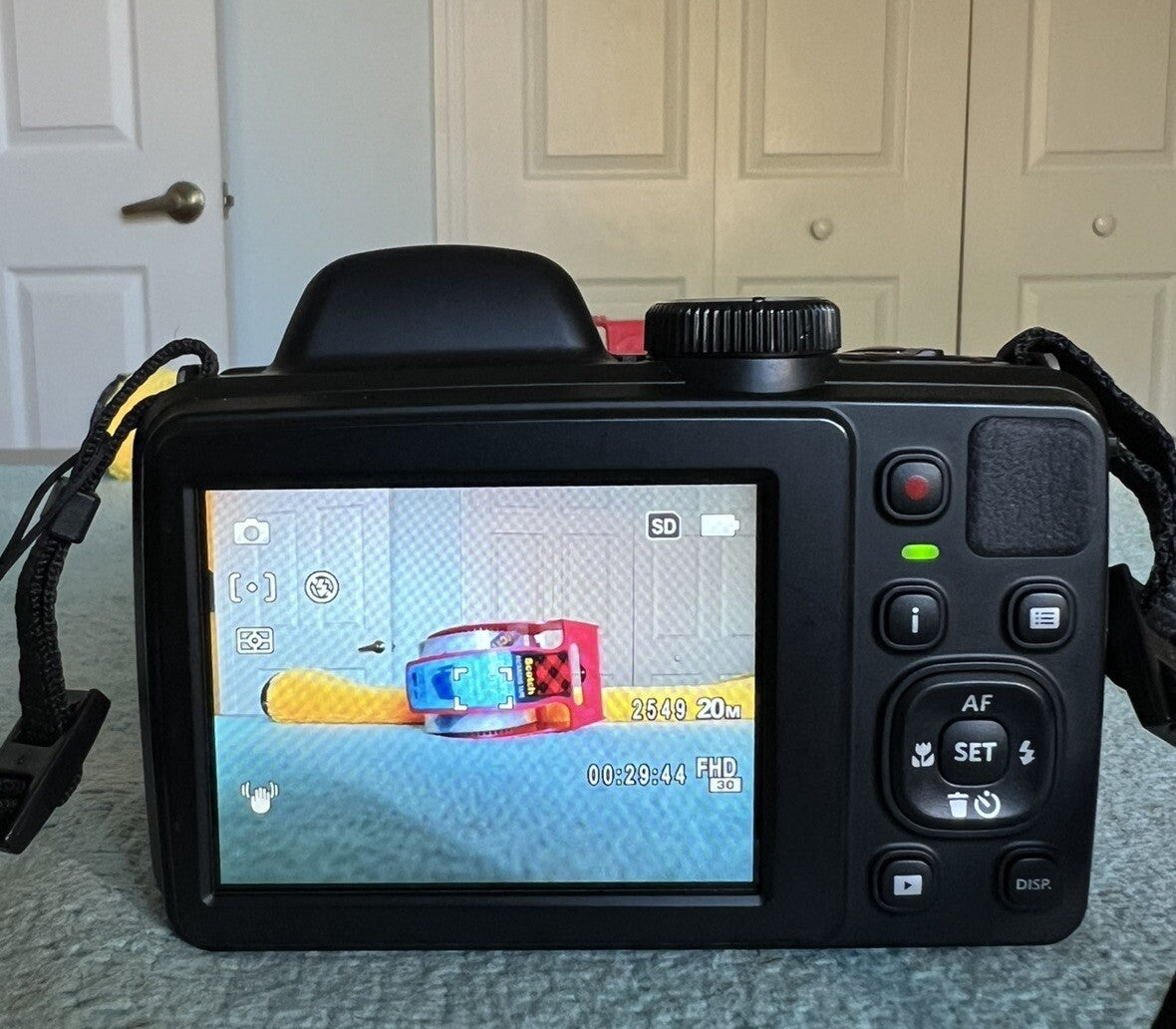 Product Description: This is a mint preowned camera that could easily pass for a new one. You get everything you need in this bundle. Comes with the mint Kodak camera shoulder strap, the Kodak lens cap, a new wall battery charging adapter, a new USB cale to upload pictures and charge the battery, a charged PixPro battery and a new Extreme Speed 16GB SDHC memory card (1000’s of pics!). Ready for action!