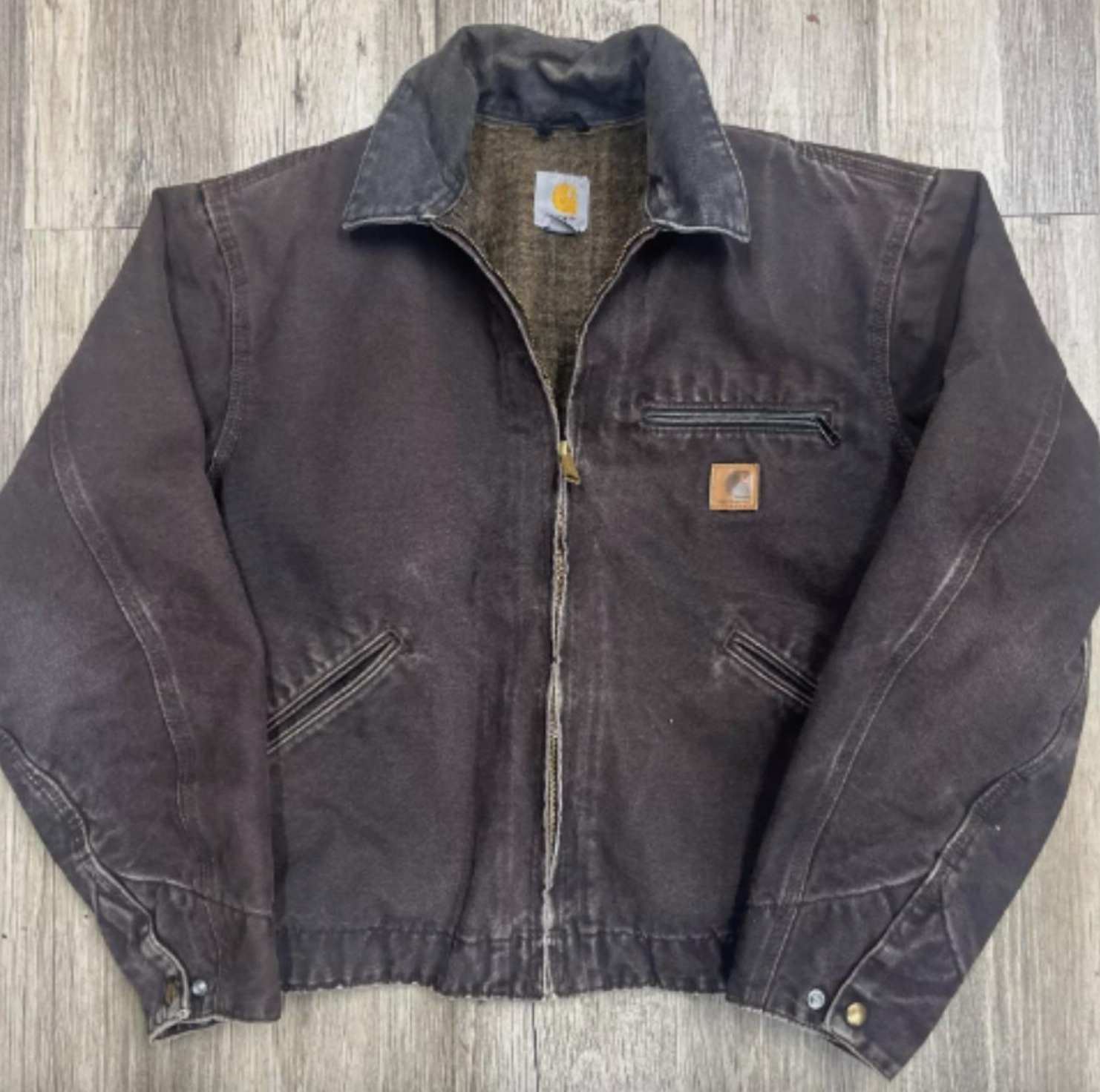 This Carhartt Detroit jacket in size M is a rare find for motorcycle jacket enthusiasts. The dark brown color and plaid pattern make it a unique addition to any wardrobe. The jacket features a zip closure, collared neckline, and multiple pockets for storage.